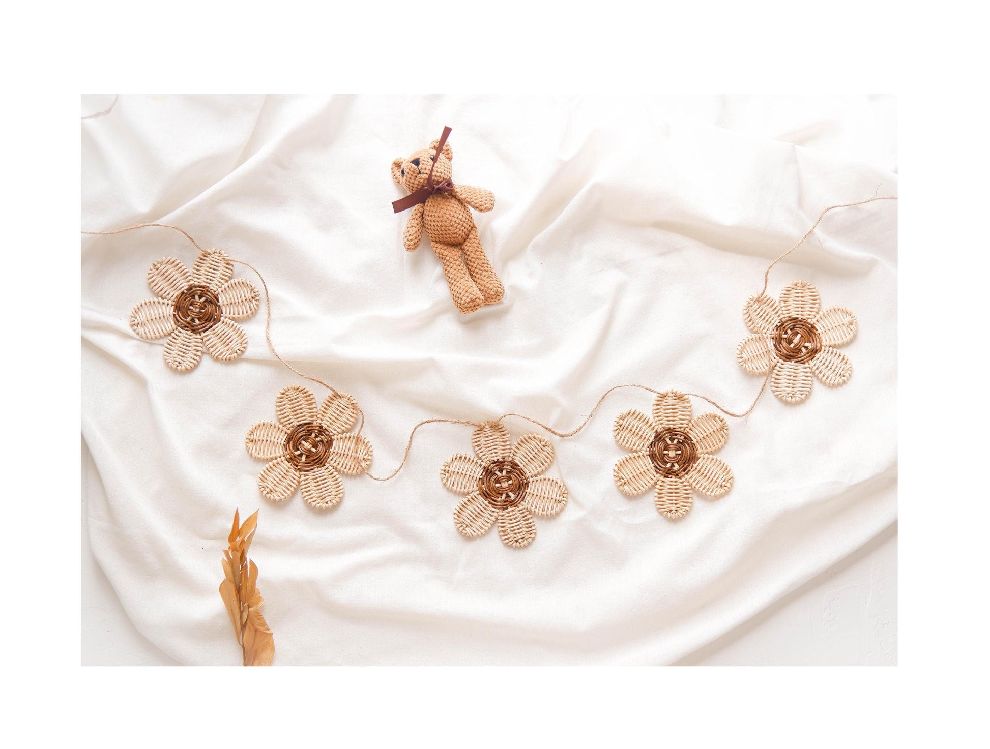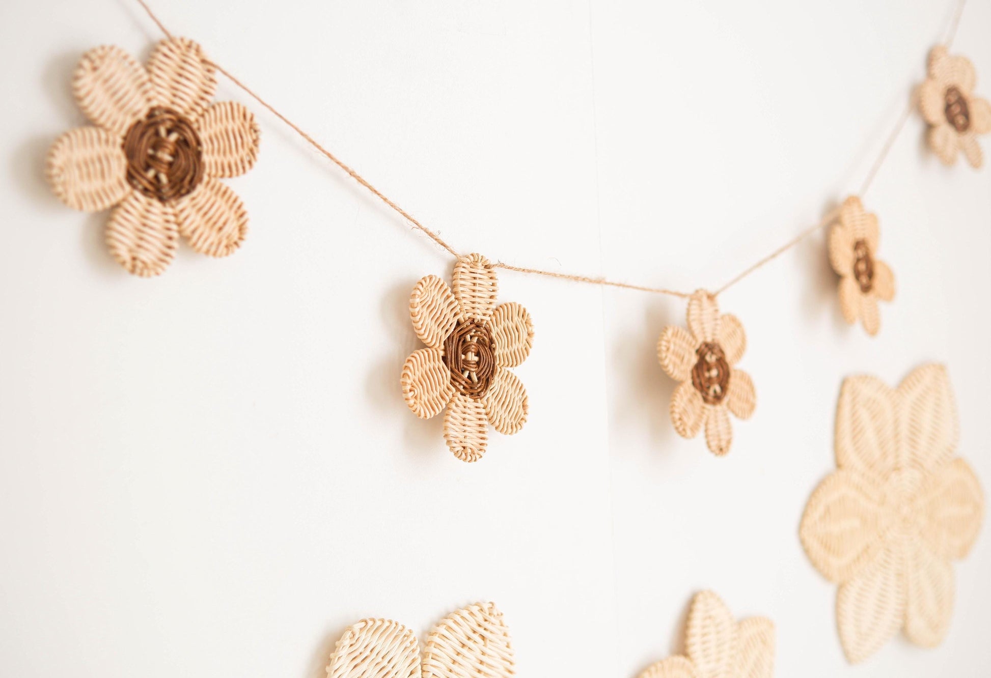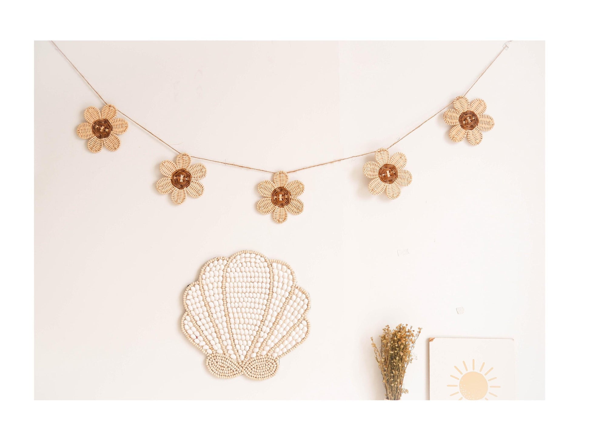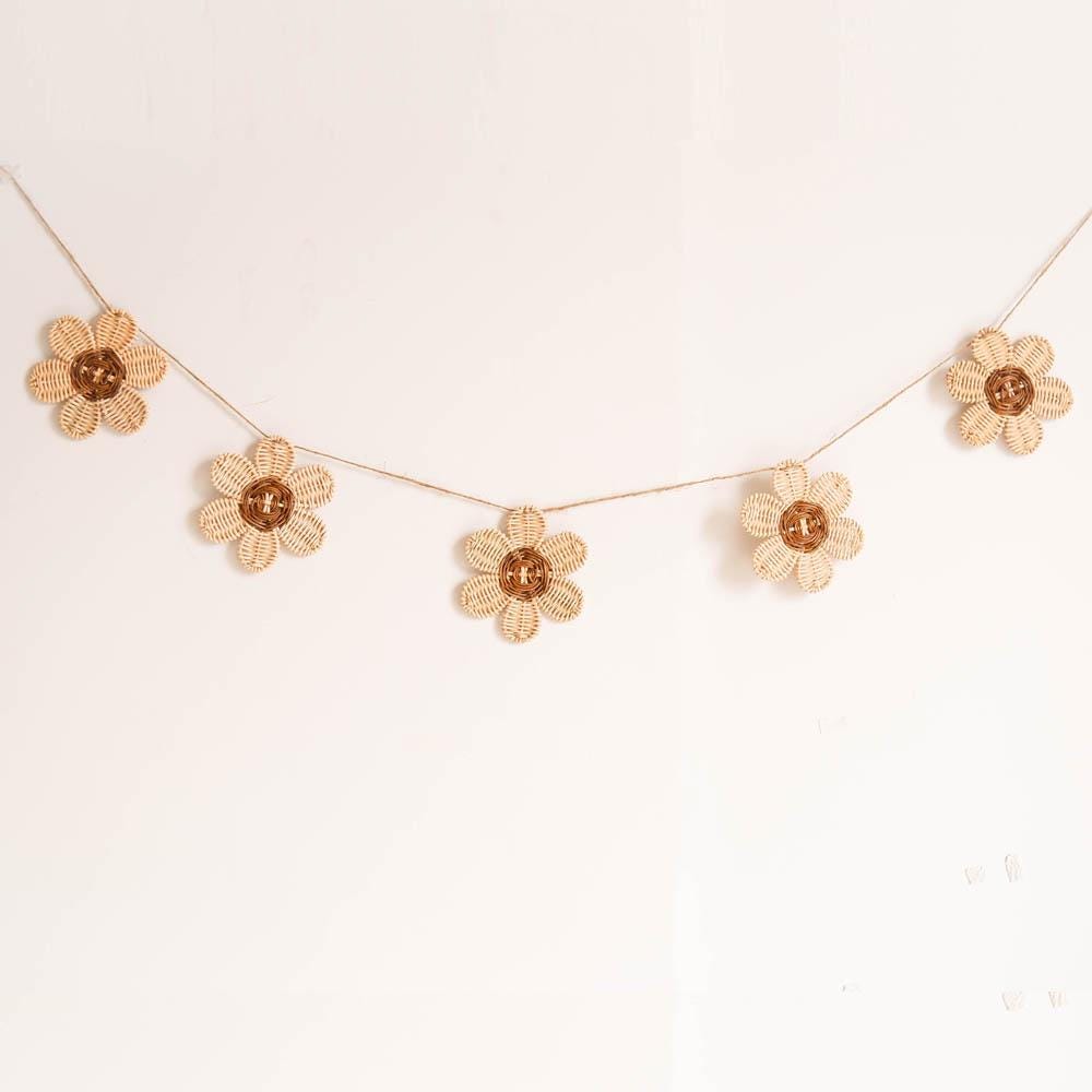 This rattan daisy garland are great for kids room decoration, nursery ornament, boho nursery decoration, baby room wall decor, and kids play room. This garland also perfect for your little one party decoration or baby photo props. Adding this pack of rattan decoration will elevate the look of your room with a little touch of boho or rustic vibes.