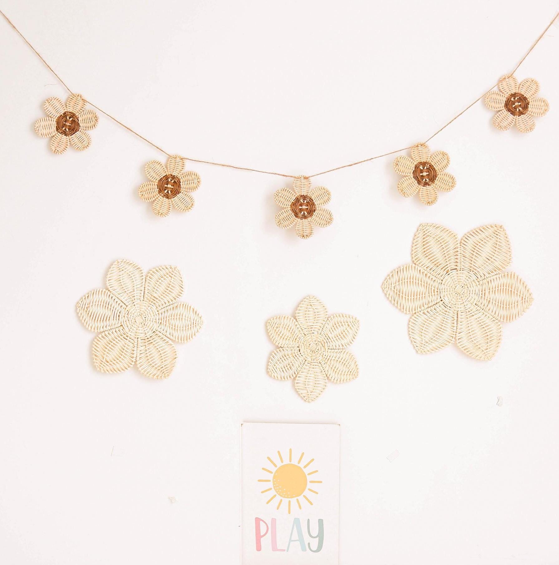 Rattan Flower Wall Decor SET, Daisy Nursery Wall Decor, Boho Girls Nursery Garland, Boho Daisy Felt Garland, Girls Room Garland Decor, Kids